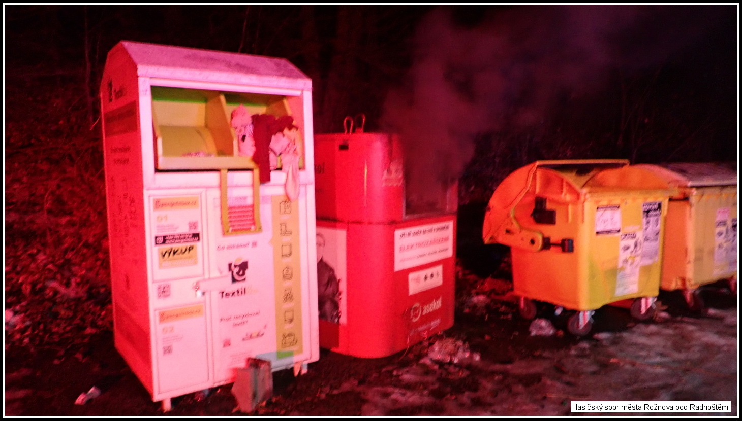 V 20:53 hod. byli vysláni profesionální hasiči města Rožnova pod Radhoštěm s technikou CAS20 Tatra Force k požáru kontejneru na elektroodpad v Zubří, ul. Pod Hůrkou. Na místo události byla současně vyslána místní jednotka SDH Zubří a jednotka HZS stanice Valašské Meziříčí.
