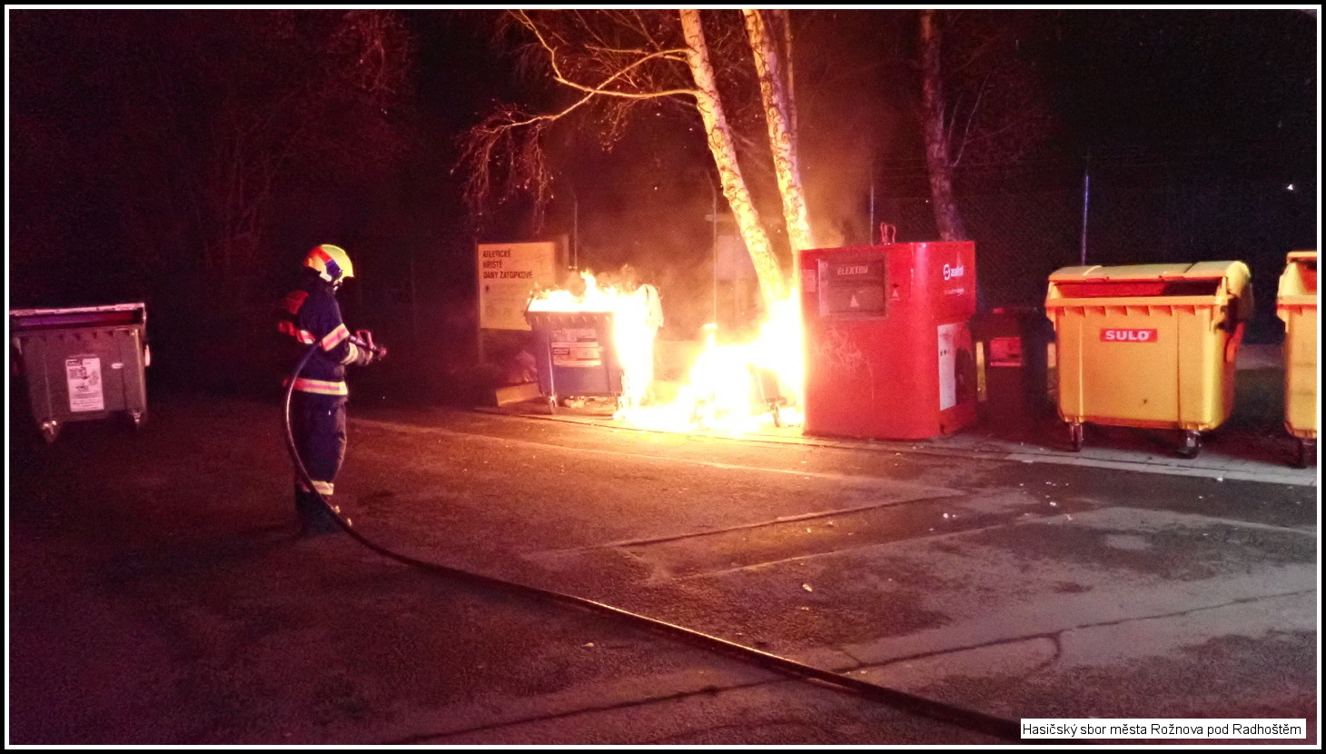 V 23:37 hod. byli vysláni profesionální hasiči města Rožnova pod Radhoštěm s technikou CAS20 Tatra Force k požáru kontejneru na tříděný odpad v Rožnově pod Radhoštěm, ul. Letenská. Současně byla na místo události vyslána hlídka Policie ČR. Po příjezdu na místo události byl potvrzen požár dvou plastových kontejneru a poškození jednoho plechového...