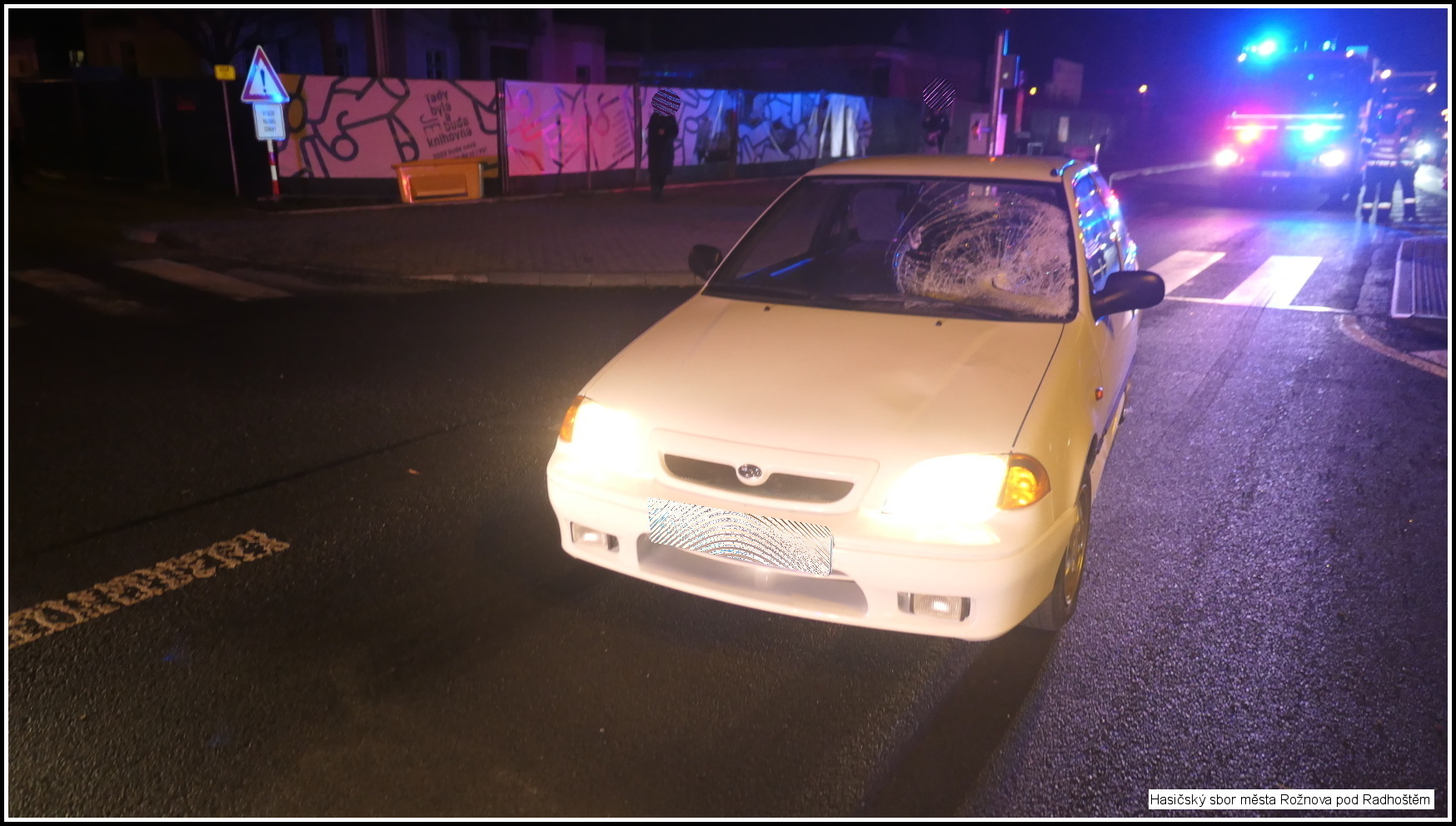 V 18:43 hod. byla vyslána jednotka profesionální hasičů města Rožnova pod Radhoštěm s technikou CAS24 Renault k dopravní nehodě v Rožnově pod Radhoštěm, ul. Nábřeží dukelských hrdinů. Současně byla na místo události vyslána jednotka HZS stanice Valašské Meziříčí, posádka ZZS a Policie ČR. Po příjezdu na místo události byla zjištěna dopravní nehoda jednoho osobního automobilu a chodce. Sražena osoba byla již v péči posádky ZZS, jednotka provedla označení a zabezpečení místa dopravní nehody. Doprava v místě události byla řízena kyvadlově. Následně po domluvě s Policii ČR se jednotky vrátily zpět na své základny.